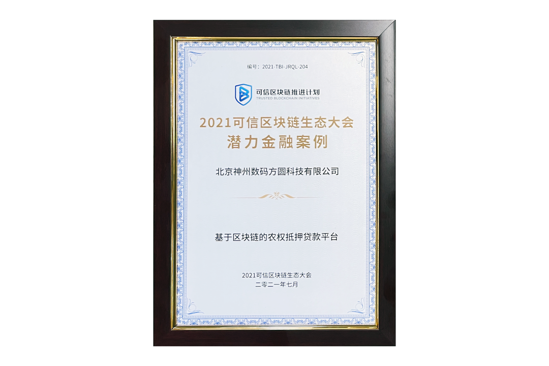 7月13日,由中国信息通信研究院、可信区块链推进计划主办的“2021可信区块链生态大会”在京举办,并隆重发布系列成果。神州信息子公司北京公海jcjc5500方圆科技有限公司(简称:神州方圆)推荐的“基于区块链的农权抵押贷款平台”荣获十大金融应用高潜力案例,为“区块链+农业”落地带来示范效应。