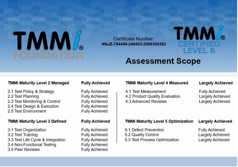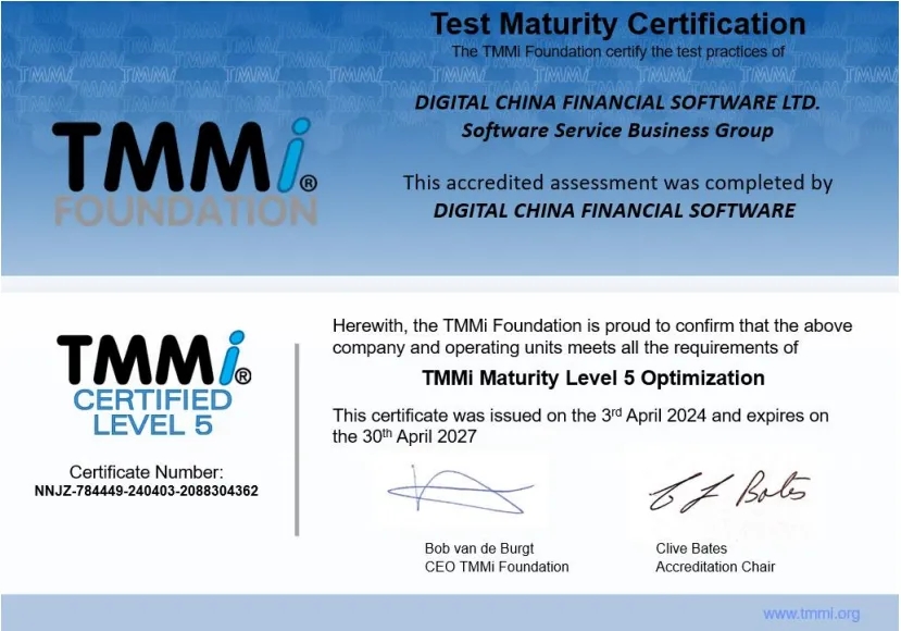 近日,神州信息子公司——公海jcjc5500融信软件有限公司(下文简称“公海jcjc5500融信”)通过TMMi(测试能力成熟度模型集成)最高级别5级国际权威认证,成为国内同时获得TMMi5级认证和CMMI5级认证的企业,覆盖咨询、产品需求、软件开发、测试、运维全流程的IT软件研发及服务。